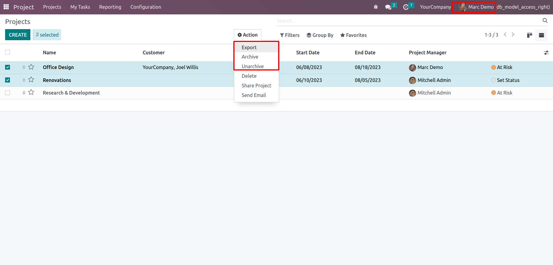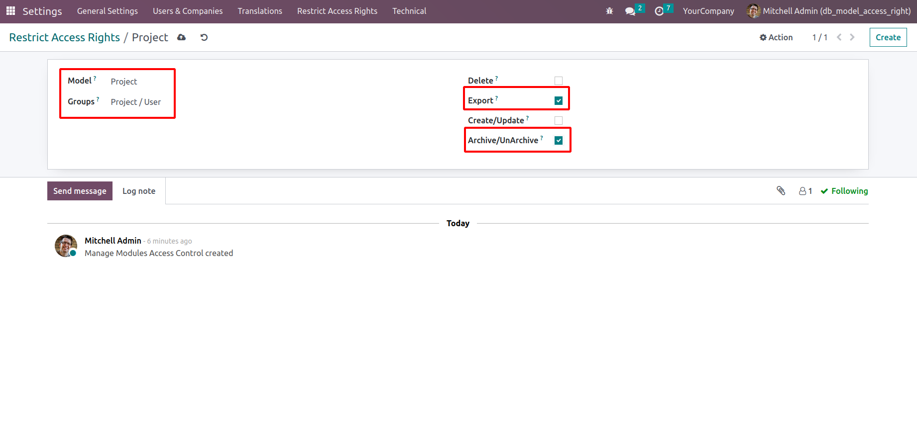By using this module we can hide the options like create,delete,export,and archive/un archive in the model which we want. Here we are also able to select the user groups except Administrator which we want to apply the above hiding functionality