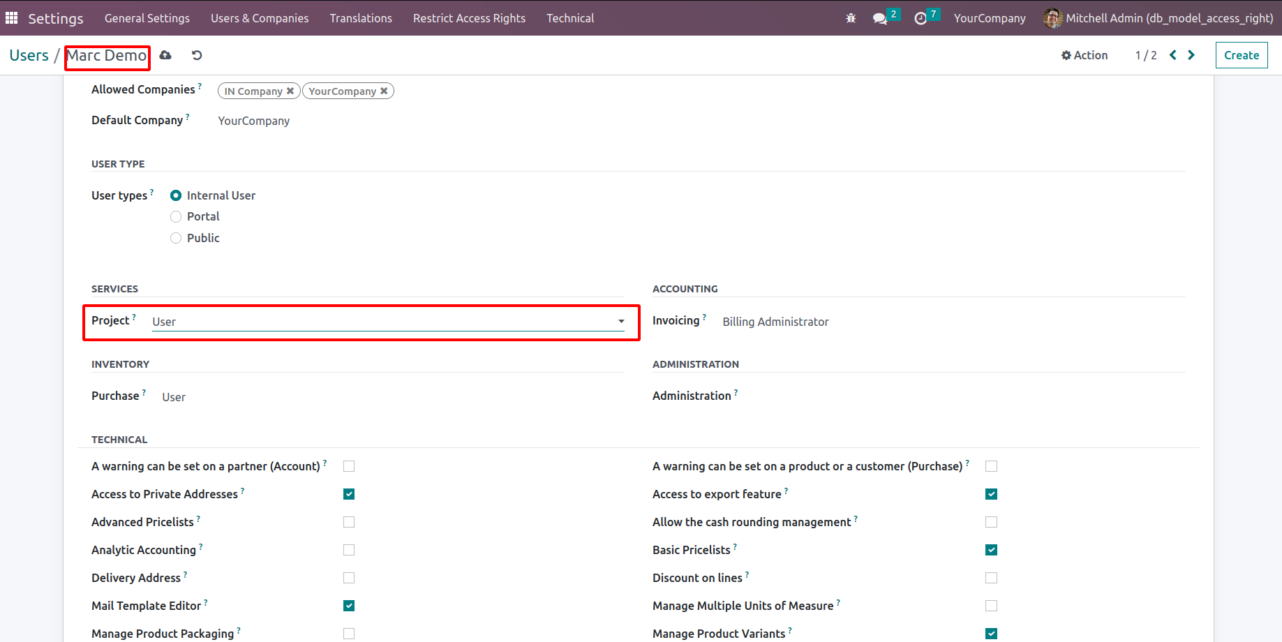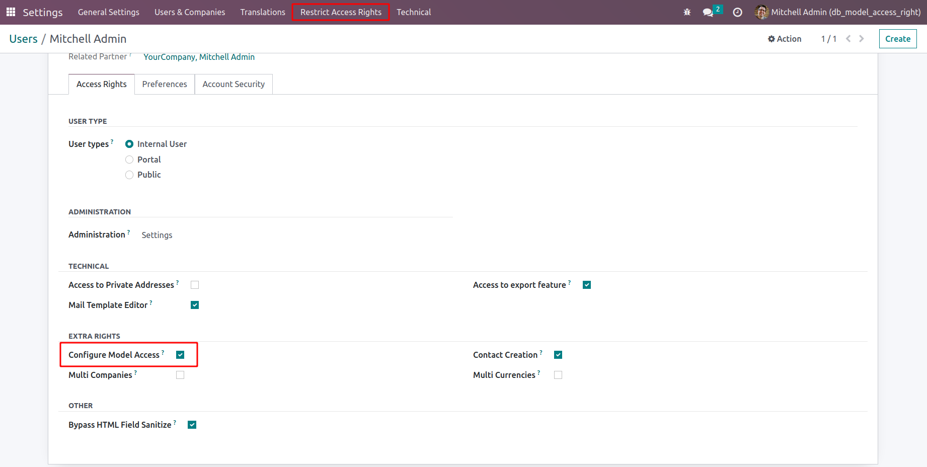 Go to Settings > Users and there you can see the Configure Model Access, by enabling that option and refresh the page, you can see a new menu named 'Restrict Access Rights'