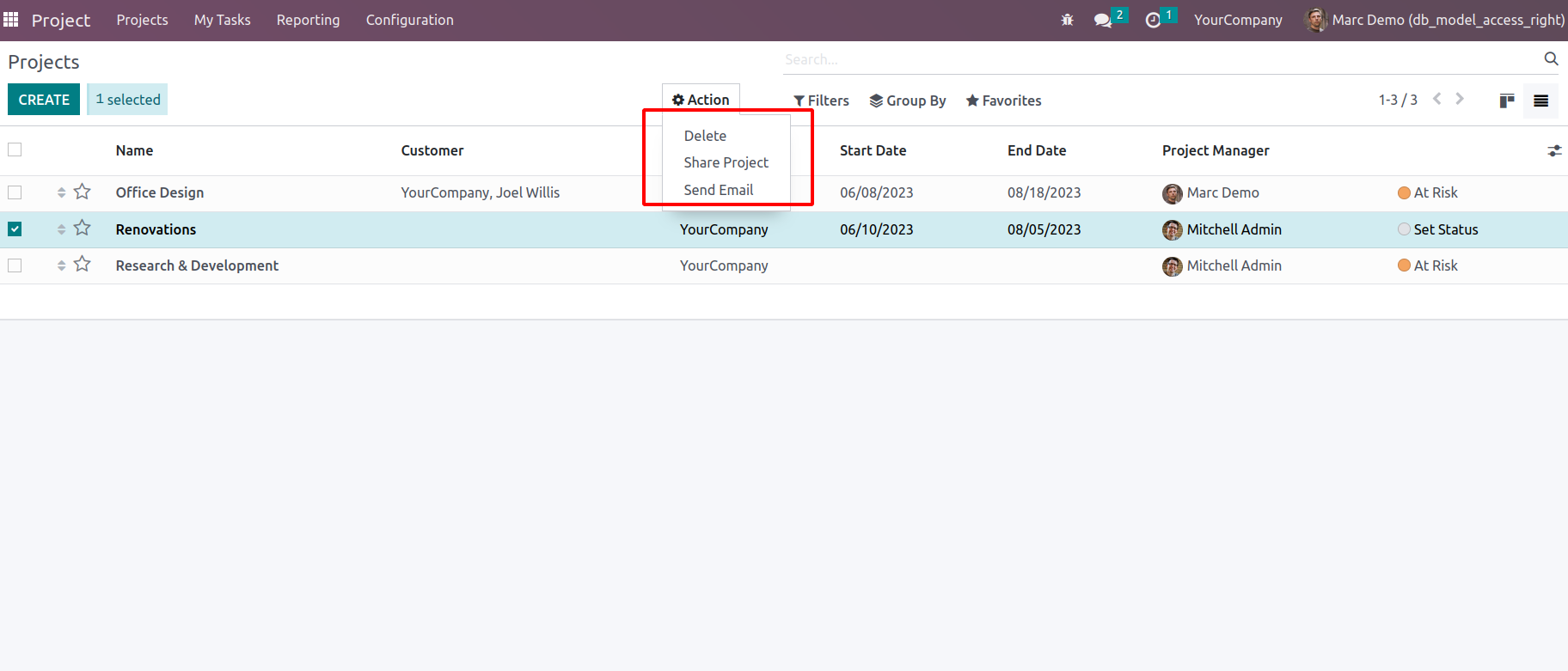 By using this module we can hide the options like create,delete,export,and archive/un archive in the model which we want. Here we are also able to select the user groups except Administrator which we want to apply the above hiding functionality